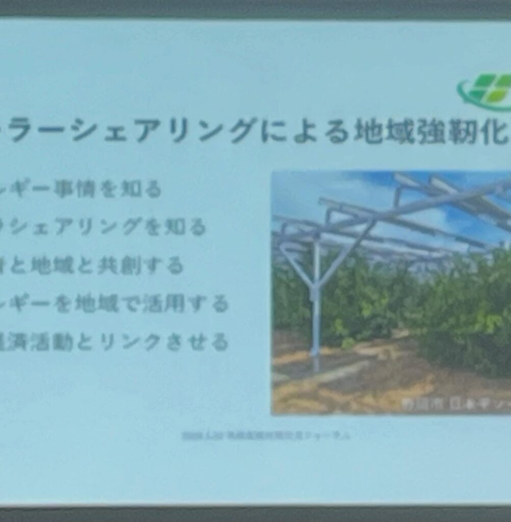やろまい会からは、北井代表理事が登壇させていただき、ソーラーシェアリングのお話と、当会の理事の活動についてお話させていただきました。